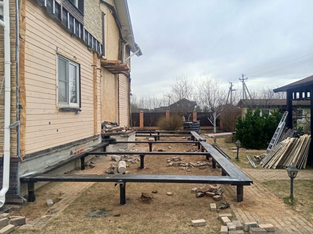 —Фундамент для будущей веранды-оранжереи из 15 винтовых свай и двух швеллеров под стены из бревна