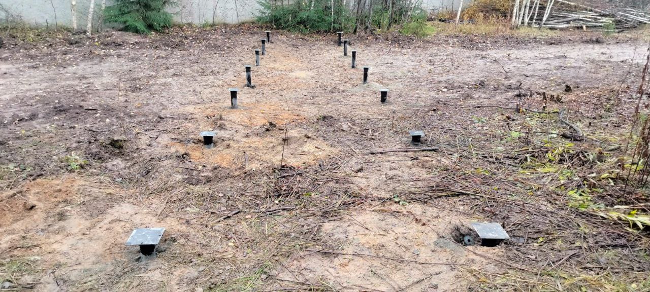 - Установка свай выполнена с использованием специализированного оборудования, что позволило добиться высокой точности. Каждая свая ввинчена строго по вертикали, независимо от перепадов высот участка.